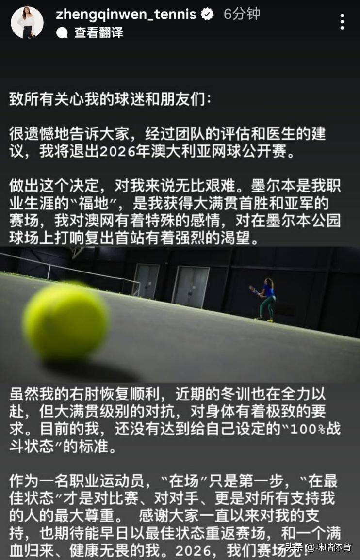 易游官网 放手澳网也要等巅峰!记者:郑钦文渴慕参赛 但未达100%竞技现象