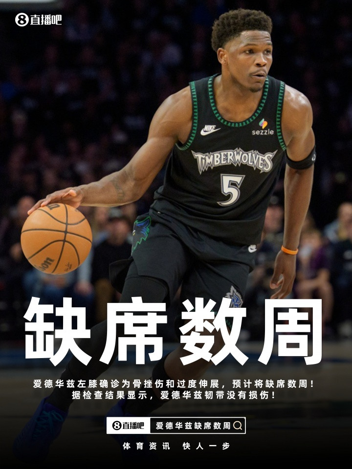 直播吧04月26日讯NBA季后赛首轮G4,丛林狼在主场以112-96礼服掘金,大比分3-1跳动。 据ESPN名记Shams报谈,丛林狼方丈球星安东尼·爱德华兹左膝确诊为骨挫伤和过度伸展,瞻望将缺席数周! 所幸,据查验后果清楚,爱德华兹韧带莫得毁伤!关联词他仍将缺席一段技巧。 季后赛G4次节,易游app爱德华兹在防患卡梅隆·约翰逊冲筐时落地膝盖受伤,随后被搀扶离场。 本场比赛,爱德华兹出战18分钟,8投1中,三分3中1,罚球2中2,取得5分3板。