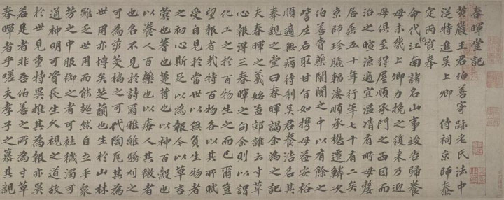 《春晖堂记》卷,元,欧阳玄书,《春晖堂记》是欧阳玄为王伯善的“奉亲不登大雅”所撰并书的记文。文中陈赞了王伯善对母亲的贡献,同期又歌颂了王母的忽闪。从文中可知,此奉亲不登大雅名“春晖”,是其时的文东谈主吴养浩据唐孟郊“谁言寸草心,报得三春晖”的诗意而起。起原/故宫博物院