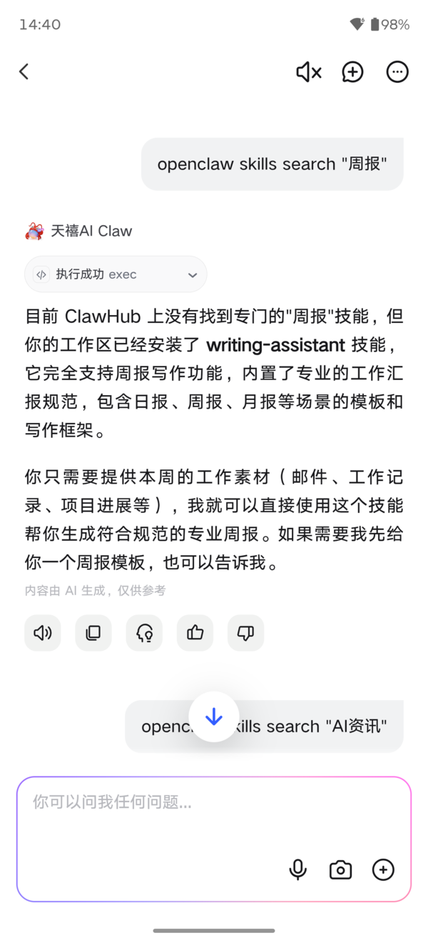【CNMO科技】每天评测各式智能树立,我仍是对厂商口中千人一面的“AI大模子”产生了一定进程的审好意思疲倦。多量手机里的AI,本色上依旧是套壳的聊天机器东谈主,停留在“你问我答”的被迫反应阶段。但此次,我在moto X70 air Pro上深度体验了天禧 Claw,它如实给我带来了一种“次元壁被碎裂”的实操感。 这不仅是一个能陪你聊天的语音包,而是一个信得过长了“行动”、能主动替你跑腿干活的赛博搭档 。以下是我深度体验后的一些真实评价。 开箱即用,莫得门槛的初体验 谈起AI大模子土产货部署,尤其是前段时期爆火的“龙虾”,许多东谈主的第一反应是“劝退”——需要设立环境、下载重大的权重文献、还要时刻惦念树立秘籍、树立的算力和内存吃不用。 而在moto X70 air Pro上初度激活天禧 Claw,最大的感受即是“渺小”。它终通晓零资本部署,免装置、免设立,通过天禧智能体APP,怒放天禧Claw不错径直通过对话使用,信得过的开箱即用。 况且,为了用户能更快的上手,它还提供了快速初学、先容特点等功能先容,让用户无意更快速、零资本的体验到天禧Claw能带来哪些变化。 同期,在内测时间它径直让你免费调用云霄超大模子,这不仅透顶目田了手机的土产货硬件压力,也让普通用户免去了折腾环境的磨折 。作为一个内容创作家,我对秘籍极其明锐。而它依托于寂然云主机启动,终通晓数据安全隔断。在使用它管束我的私东谈主邮件和里面文档时,这份“安全可委派”的盘算让我吃了一颗舒适丸。 越用越顺遂的“养成系”超等Agent 过往,非论是手机的AI助手,如故大厂AI APP,用户只可体验到出厂预设集成好的功能。但天禧 Claw碎裂了这个局限,它展现出了云主机“苍劲才智可自界说推广”的中枢上风。除了预装的高质地天禧专属Skills,它最让我惊喜的是支撑装置第三方Skills,终通晓信得过的零门槛使用,况且功能越用越多,持续进化。 我躬行测试了它的Skills。比如,针对日报、周报这个重迭的使命,通过天禧内置的writing-assistant手段,只需要将邮件、使命记载等素材提供给他,他便能生成一份标准、可用的日报、周报文献。 此外,若是预装的Skills无法知足条目,还不错径直从Claw HUB上径直装置干系的Skills来完成更个性化、高阶的需求。而且装置经由独特简便,只需要输入敕令Open Claw skills Search+需要的手段需求即可。 不外,但是现在使用用户太多,易游娱乐API调用频率过高,有时也会出现无法搜索的气象。但是天禧 Claw也会把柄你的需求,推选现在仍是预装访佛的Skills供你使用。不错说这种我方“装置行动”的才智,让它从一个器具转念为了一个懂我使命流的专属Agent。 断网关机,我的AI还在打工 其实,关于手机端AI来说,还有小数很让作为用户的我头疼,普通在查询尊府时,屏幕一息、后台一杀,AI任务径直中断。而天禧Claw则从起源根绝了这种问题的出现,它能终了“全天候跨端”和“7x24在线”才智 。 为了考据这个才智,我给它出了一个不毛,晚上临睡前,我给它下发了一个长线任务:“每天早上9点帮我握取科技圈最新热门,按AI、新动力、互联网分类整理到我的学问库;同期跟我学问库里之前作念过的内容作念比对,过滤掉雷同题材” 。 下达收场后,我径直把moto X70 air Pro关机了。第二天早上开机:一份带有磋磨、提要以及“新颖度评分”的去重晨报,仍是安舒适静地躺在我的学问库里了 。这种端云搀杂部署的架构号称“虾中卷王” 。树立关机,任务不断,后台任务持续启动且随时待命 。它不再受限于你的手机状态,而是信得过成为了一个全天候在线的私东谈主助理。 无缝联贯的跨端“长期牵记” 相较于上头才智的推崇,天禧Claw最让我惊喜的功能是,它无意终了跨树立、末端的无缝联贯,这关于打工东谈主来说独特友好。日常使命中咱们每天皆在手机、平板和PC之间反复横跳,信息的割裂是常态。 天禧Claw的“生态跨端协同”才智 ,透顶缝合了这些碎屑。白日在外驱驰,我用moto X70 air Pro唾手记载:我对入辖下手机语音输入“记载灵感 。它不仅存入了我的天禧学问库,还展现了可怕的“长期牵记”才智 。它智能比对了我的历史记载,教导我这与此前的某笔记载可变成系列选题。 晚上家里怒放电脑,总计的高下文好意思满同步。我只需接着对PC端的小天说:帮我匹配本周热门和我的灵感,遗弃跟我历史著作重迭的标的,生成几个合适我作念的高后劲选题” 。手机端的已而灵感与PC端的深度创作终通晓无缝对接,这种体验极其通顺。 写在终末:经过这段时期的体验,我以为天禧 Claw并莫得停留在生硬的本事堆砌上,而是精确切入了咱们在真实生涯和办公场景中的痛点。它开箱即用、越用越新、7x24接续线,是一个信得过全树立可用的超等助手 。它评释了AI的价值不在于陪你谈天,而在于它能多猛进程地罗致你的参差使务。若是你也对那些只会回复“好的,我显现了”的AI感到厌倦,那么这个颖慧实事的新物种易游娱乐,十足会刷新你的贯通。 PG电子(PocketGames)游戏官网 |