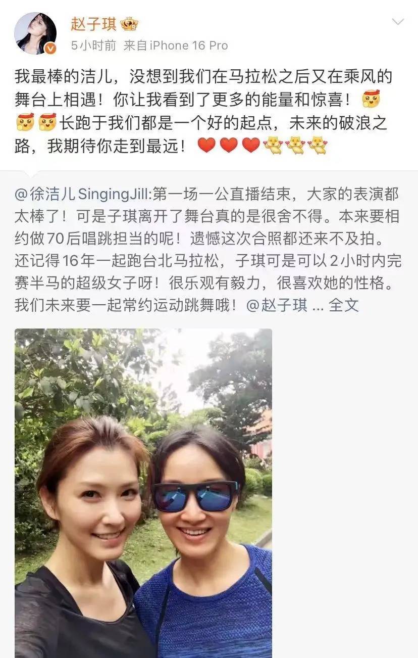 徐洁儿发文提到赵子琪,称她亦然可爱跑半马,她在2小时内跑完半马,很乐不雅很有闭塞,很可爱她的特性,改日扫数常约率领舞蹈哦。 赵子琪也报告了徐洁儿,示意最棒的洁儿,没猜测在马拉松之后又在乘风的舞台上再会,示意徐洁儿让她看到了更多的能量和惊喜!长跑关于她们来说皆是一个好的早先,改日的破浪之路,期待她走得更远。 赵子琪和李小冉可能不熟,天然扫数连续过,但亦然好多年前的事了,不料识不练习皆很宽泛,看来赵子琪圈子中的姐姐也未几,孙怡和张慧雯皆莫得与她互动。
