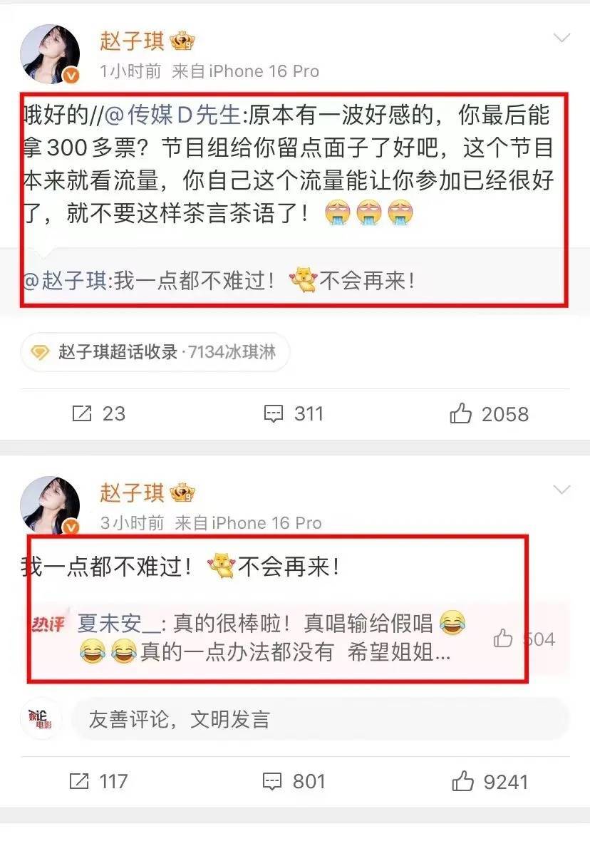 赛后赵子琪发文示意,我方极少皆不痛心,不会再来了。 但有位网友却是这样安危她的,说正本有一波好感,但她临了能拿到300多票?节目组给她留点好看好吧,这个节目本来就看流量,她我方这个流量能让她投入仍是很好了,就不要这样茶言茶语了。 赵子琪可能合计这位网友说得也很可以,还报告好的。
