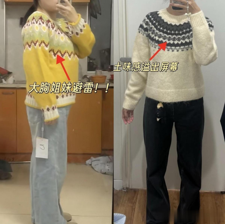 自此基础上淌若再配上一条弯刀裤,全体的恶果兼职就是“村炮”的代名词。毕竟弯刀裤从膝盖处运转就进行了夸张的外扩,但裤脚处又内收,穿上身让整条腿勾画得像是两把镰刀,污蔑感实在是很强,实在是不利于晋升造型所需的修长感。 #强行相持代表#费尔岛毛衣+阔腿裤 >>>错误:费尔岛毛衣肯定大众齐很矜重了,它本来是北欧手作的平和象征,花色上基本齐是由那些荧光红、电光蓝、芥末黄三色构成撞色驯鹿,再叠满一些锯齿边的雪花图案。这些高弥漫、强对比的图案堆砌在一说念,加上本就量感重的毛衣类型,卓越显胖显肿,对黄黑皮、圆脸、肩宽星东说念主齐不错说是祸害。