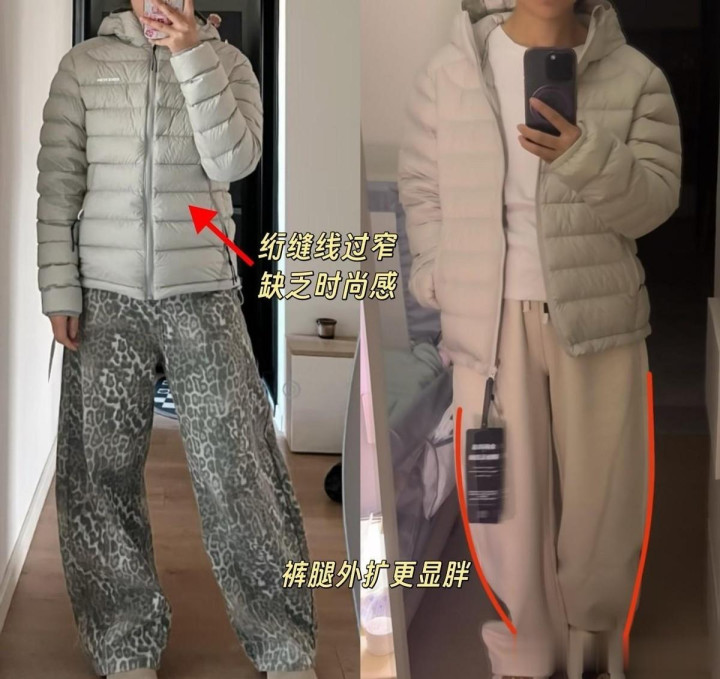 在此基础上配上一对过膝的长靴,会让视觉聚焦在小腿的位置,这关于小腿粗的女东说念主来说无疑是放大错误的存在。 #土味个性代表#排骨羽绒服+弯刀裤 >>>错误:排骨羽绒服天然期骗比拟密的绗缝,野蛮显瘦的版型成绩了深广粉丝的刺目。但内容上正常女东说念主是很难独霸的,毕竟它自身的气场很足,淌若莫得颜值和身材的加持,很容易出现拉宽肩背、压缩腰线的问题。