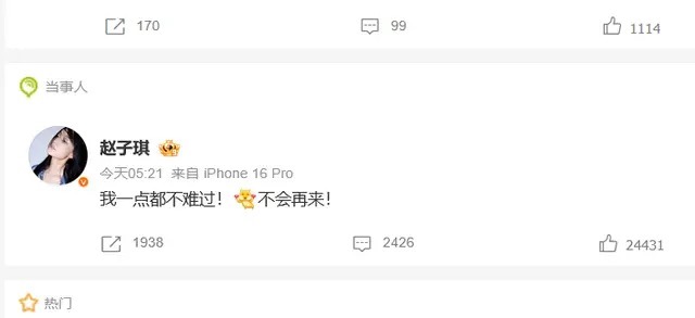 你知谈什么叫赢了斗争却输了干戈吗?你知谈什么叫规矩杀死实力吗?4月11日,赵子琪用一条微博掀起热搜——"不会再来浪姐"。五个字,谈尽一个49岁女演员的体面与决绝。这到底是在解决不勤奋的东谈主,已经在玷污太发扬的东谈主?